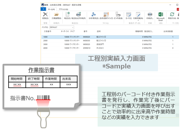 工程別のバーコード付き作業指示書を発行し、作業完了後にバーコードで実績入力画面を呼び出すことで効率的に出来高や作業時間などの実績を入力できるようにする機能です。