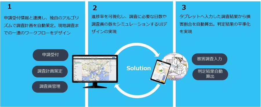 「罹災証明迅速化ソリューション」が、災害を経験した自治体の知見と富士フイルムグループの画像処理技術等の組み合わせによって、実災害において住民の復興に必要となる罹災証明書の交付までの時間を短縮した実績がある点が評価されました。