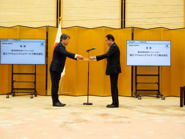 富士フイルムシステムサービス株式会社(本社:東京都新宿区、代表取締役社長:井上 あまね)は、内閣官房が主催する「Digi 田(デジでん)甲子園2023」企業・団体部門で優勝し、「内閣総理大臣賞」の受賞者として、2024年3月6日に岸田 文雄内閣総理大臣から表彰を受けましたので、お知らせします。当社が提供する「罹災証明迅速化ソリューション」を通じて、災害発生時の自治体による罹災証明書交付の迅速化に貢献したことが評価されました。