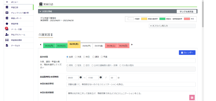学生の皆さんが実習時に作成する実習日誌や実習評価内容をシステム上に登録することで、リアルタイムに教員の方々へ実習内容の共有をすることができます。それにより教員様は、必要なサポートを即時に実施することが可能となります。