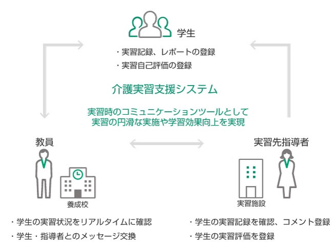 介護実習支援システムの導入により、養成校と実習施設との連携を強化し一体的に実習を推進することが可能です。学生の皆さんのモチベーションを高め主体的な学びを促進し、実習時の学習効果向上を実現します。
