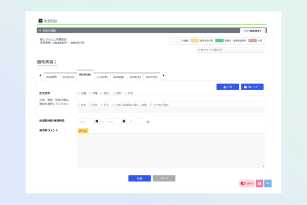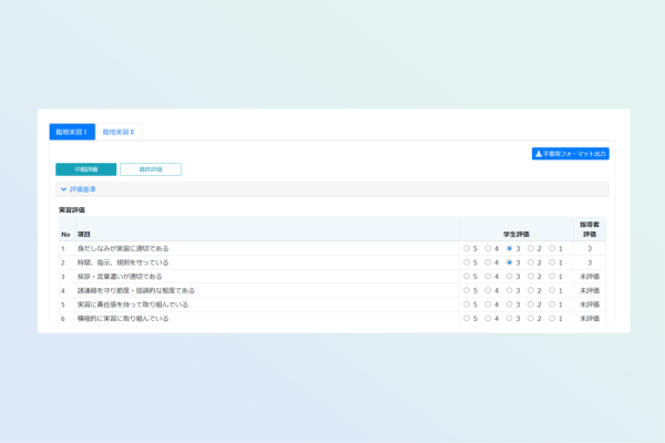 - 出欠席や実習評価などのデータが、システム上で収集・集計されるため、作業に要する時間を大幅に軽減することができます。