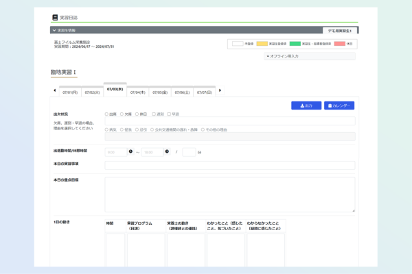 日々の日誌の振り返りや1週間を通じての改善策の記載、指導者コメントの確認ができるため、翌日や翌週の実習に役立てられ、自己評価と指導者評価をすり合わせ、自身の到達度を把握できます。