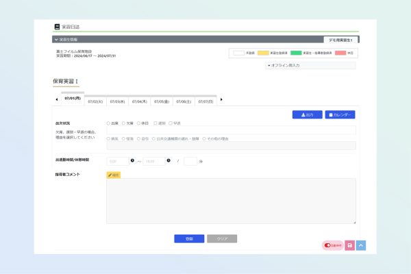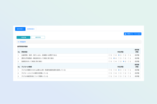日々の日誌の振り返りや1週間を通じての改善策の記載、指導者コメントの確認ができるため、翌日や翌週の実習に役立てられ、自己評価と指導者評価をすり合わせ、自身の到達度を把握できます。