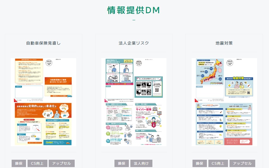 募集人と契約者との関係強化には、最適なタイミングで最適な情報の提供が求められます。しかし、数多くの契約者を訪問するには限界がある為、ダイレクトメール(DM)などの代替手段が用いられます。ところが、DMの企画・デザインには専門的な知識が必要となり、また、発注数量に依存するDM単価に悩まされるなど、数々の理由によりDMは利用していないという声が代理店様から寄せられています。
