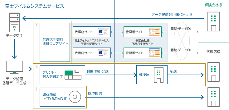 保険会社様が自社の商品をより多く取り扱ってもらうためには、主要販売チャネルである代理店へのきめ細かなサービスが重要となります。 富士フイルムシステムサービスの代理店支援ソリューションは、手数料明細を代理店にとって、「はやく」・「わかりやすく」・「つかいやすく」通知することをコンセプトに、代理店のニーズにあわせた形体で手数料明細を提供します。 マルチソース(紙、電子媒体、Web)で手数料明細を提供することで、代理店の利便性を向上させることと、紙による手数料明細の提供を電子データへ置き換えることで省資源化(環境対応)の実現につなげます。