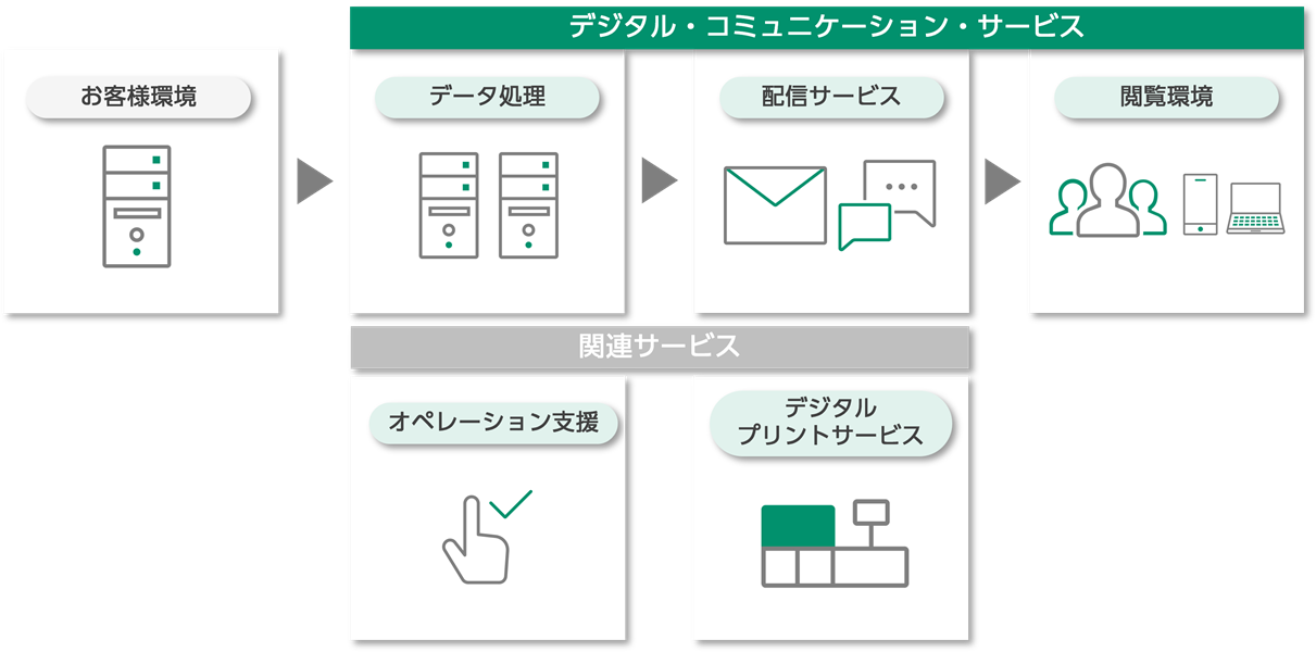 用途や目的に応じた帳票作成のご提案から、個人向け通知物などの多品種少量、大量ロットまで幅広くデジタル・プリントをご提供するサービスです。