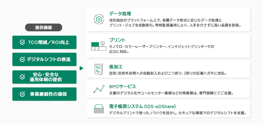 - 日々の通知物発行から月次の大量帳票出力まで、品質・セキュリティー・事業継続を考慮した運用環境の構築が可能な、安心できる会社に委託したい