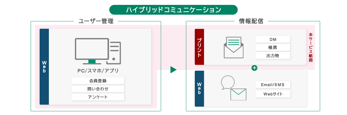 従来の紙による情報発信からデジタルシフトを支援し、Email/SMSやWebサイトなど受信者に合わせた最適な発信方法をご提案します。