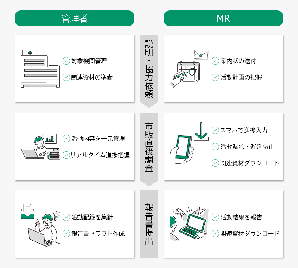 MRや医療施設ごとの状況や今後のスケジュールが可視化され、市販直後調査の進捗管理を効率的に支援します。
