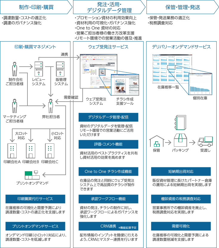 - 営業ご担当者様が、紙資材や電子コンテンツにいつでもアクセスできる営業支援の仕組みを構築いたします