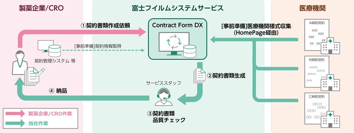契約書類作成プラットフォーム『Contract Form DX』を活用し、必要となる情報が空所補充済の書類をサービススタッフがチェックしたうえで、当社から製薬企業/CROに納品するサービス