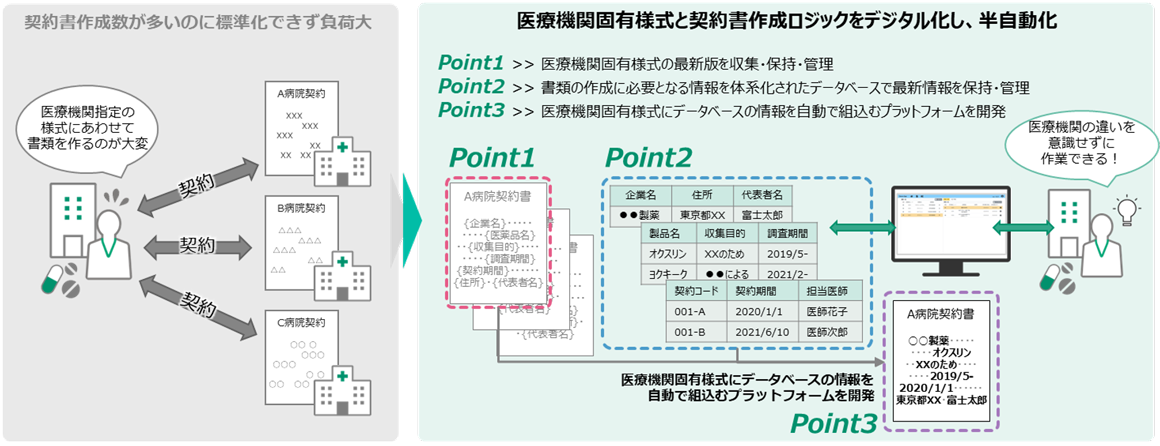 製薬企業とCRO向けに「製造販売後調査契約支援サービス」の提供を開始しました。製造販売後調査に伴う製薬企業と医療施設間の契約書類作成業務において、必要情報を自動で組込むWebプラットフォームを活用することで、当該業務の約60%の削減を見込むことが可能です。