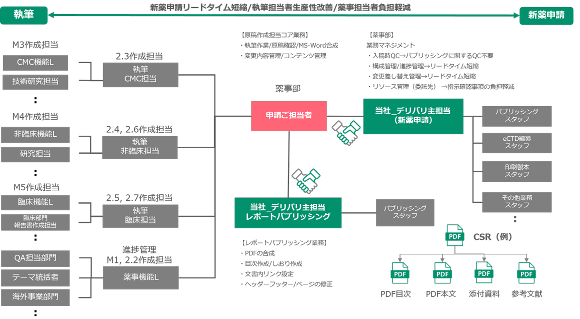 22年に渡りご支援してきた、医薬品の製造販売承認申請から取得までに必要な資料作成をワンストップでご支援してきた「新薬申請サービス」のノウハウを生かしたサービスです。具体的には、申請資料作成の上流工程である試験総括報告書(CSR)の作成段階で規制要件仕様で申請添付資料を作成するサービスで、新薬の製造販売申請の納期短縮に繋がります。お客様はコア業務である申請資料のコンテンツ作成(執筆)に専念いただけます。
