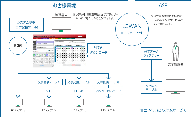 また、LGWAN-ASPサービスを利用し、外字フォントの作成や文字の統合管理が可能です。LGWAN-ASPサービスなので、LGWAN接続環境(もしくはインターネット)とウェブブラウザーがあれば導入することができます。