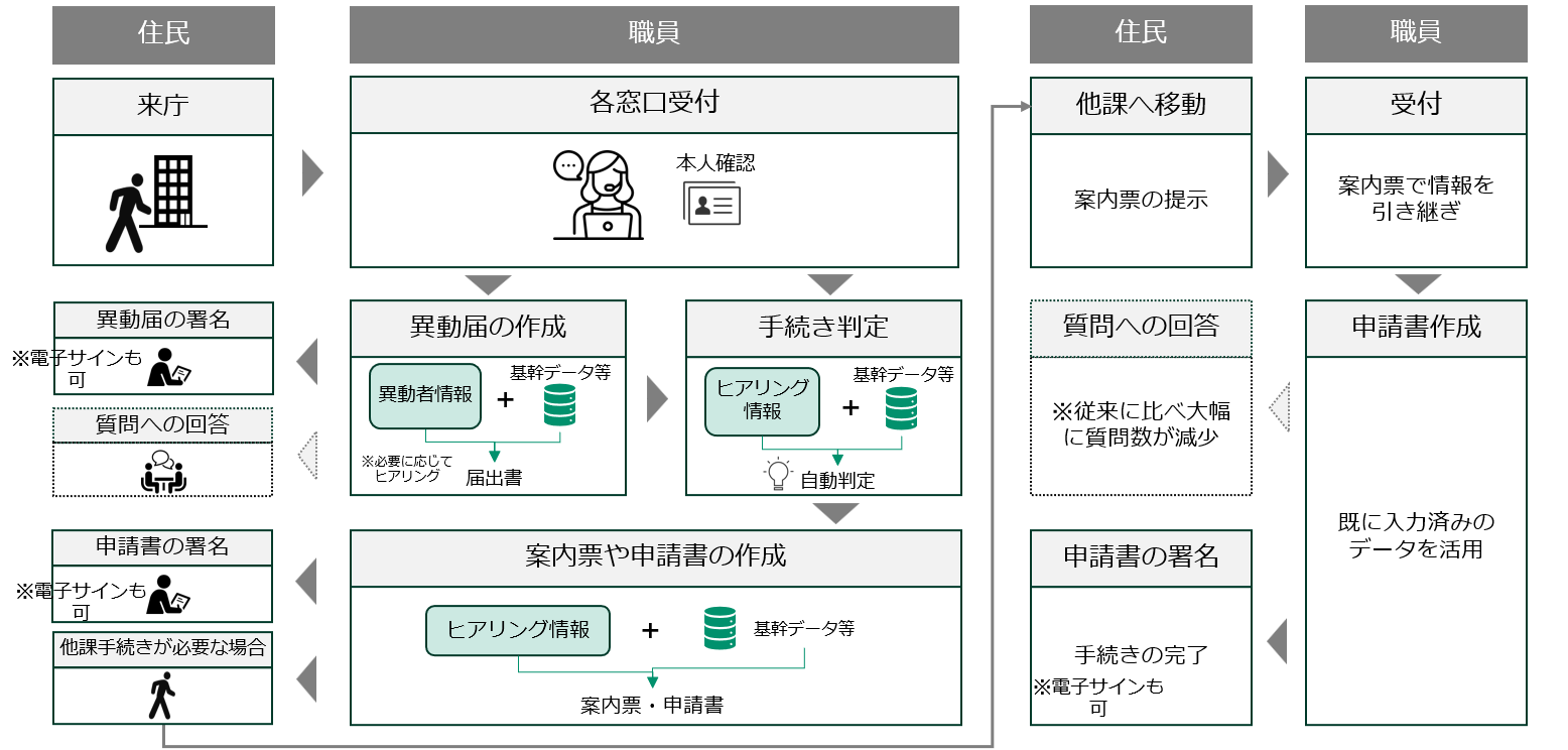 職員が住民対面で手続きをする際、自治体の基幹系業務システムのデータを活用し、異動受付だけでなく、子育てや介護といった申請者の状況に合わせた窓口受付やガイダンスを自動判定します。職員は、複数の課にまたがる手続きであっても、画面上に表示されたヒアリング項目に沿って入力することで、職員の経験の有無や熟練度に関わらず、住民のライフイベントに合わせて漏れなく必要な手続きを案内することが可能となります。さらに、全ての手続きを一続きに行うことで、「何度も同じ項目を書かされる」、「都度、窓口で待たされる」「複数の窓口に回される」といった住民の課題を解消し、「書かないワンストップ窓口」が実現します。