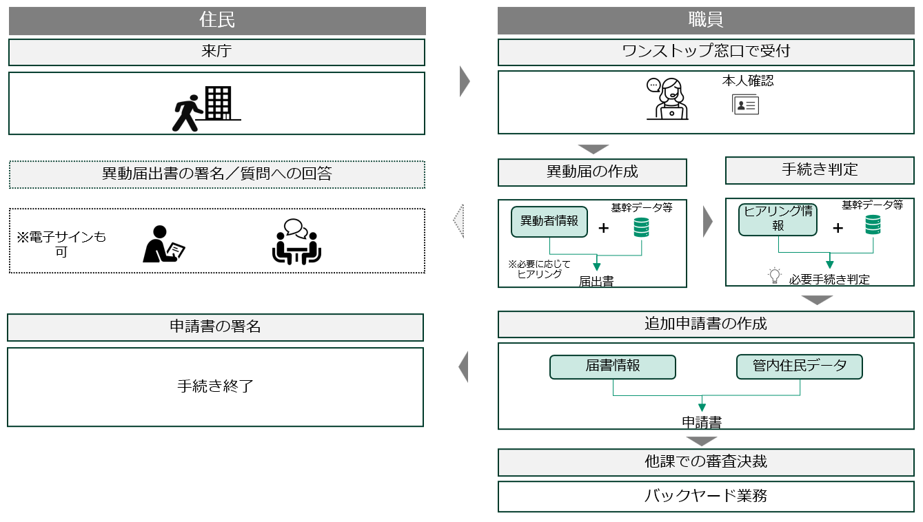 職員が住民対面で手続きをする際、自治体の基幹系業務システムのデータを活用し、異動受付だけでなく、子育てや介護といった申請者の状況に合わせた窓口受付やガイダンスを自動判定します。職員は、複数の課にまたがる手続きであっても、画面上に表示されたヒアリング項目に沿って入力することで、職員の経験の有無や熟練度に関わらず、住民のライフイベントに合わせて漏れなく必要な手続きを案内することが可能となります。さらに、全ての手続きを一続きに行うことで、「何度も同じ項目を書かされる」、「都度、窓口で待たされる」「複数の窓口に回される」といった住民の課題を解消し、「書かないワンストップ窓口」が実現します。