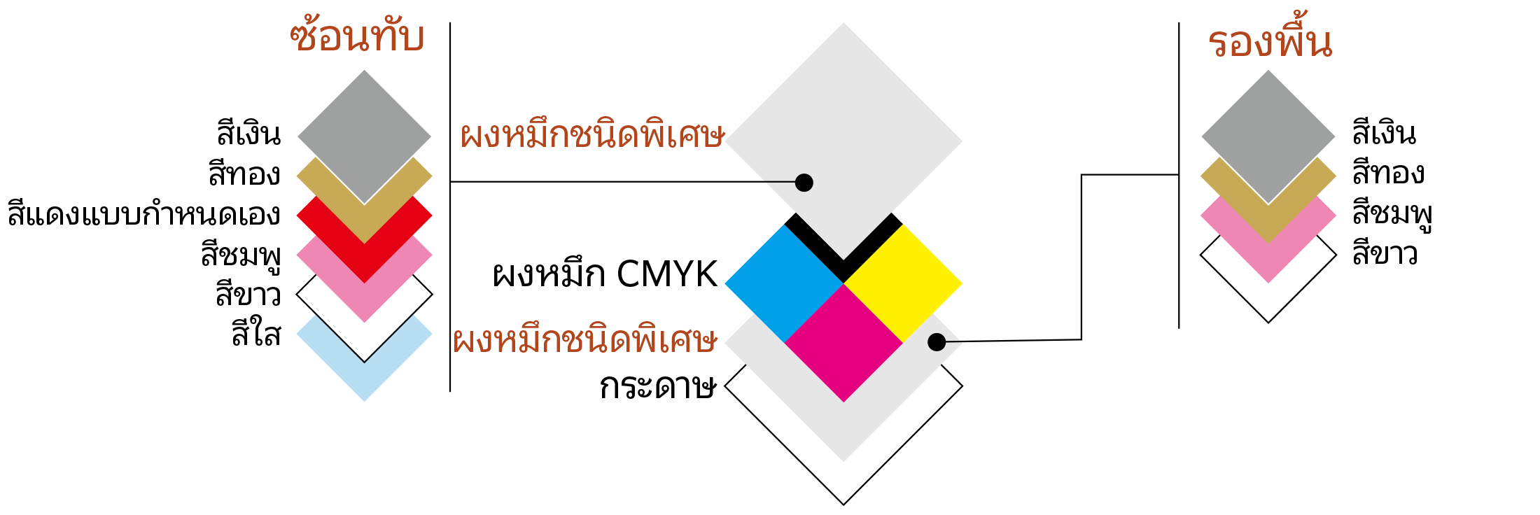 ด้วยการซ้อนทับสี CMYK ลงบนสีเงินหรือสีทอง คุณจึงสามารถพิมพ์สี เมทัลลิกต่างๆ ได้หลากหลายตามต้องการ