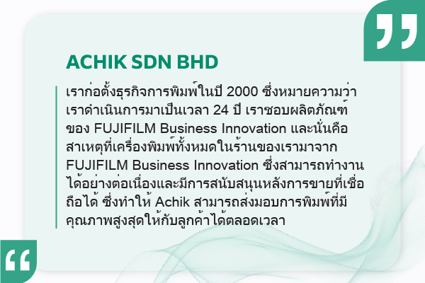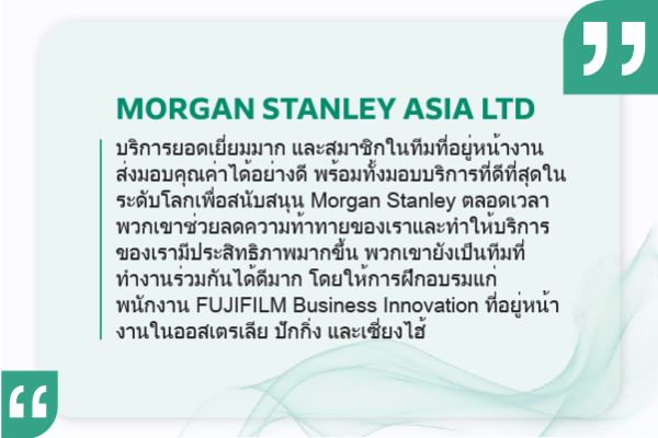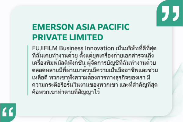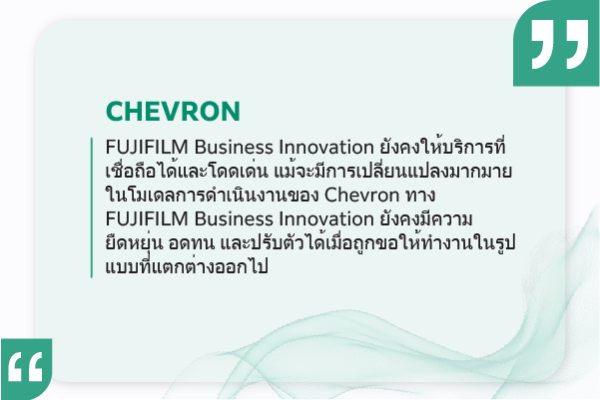 ในช่วงทศวรรษที่ผ่านมา FUJIFILM Business Innovation ได้ทำงานร่วมกับลูกค้าและพันธมิตรของเราเพื่อตอบสนองความต้องการที่หลากหลายด้วยชุดโซลูชันที่ปรับแต่งและพร้อมใช้งาน อ่านเรื่องราวของพวกเขาและค้นหาว่าเราได้จัดการกับความท้าทายทางธุรกิจที่สำคัญของพวกเขาอย่างไรด้วยผลลัพธ์ที่โดดเด่น ตั้งแต่การเพิ่มรายได้ การเพิ่มผลผลิต ไปจนถึงความยั่งยืนในระยะยาว