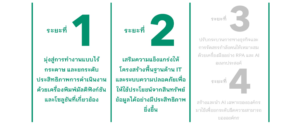 เมื่อองค์ประกอบพื้นฐานของการเปลี่ยนผ่านสู่ดิจิทัลขององค์กรพร้อมแล้ว ขั้นตอนถัดไปคืออะไร คุณคิกูจิอธิบายว่า “หลังจากสร้างโครงสร้างพื้นฐานด้าน IT ที่แข็งแกร่งแล้ว ระยะถัดไปคือการนําโครงสร้างนั้นมาใช้เชิงกลยุทธ์ เพื่อขับ เคลื่อนการเปลี่ยนแปลงกระบวนการทางธุรกิจ” เขากล่าวต่อว่า “สิงที ่ ่จําเป็นในระยะนี้คือแนวทางแบบองค์รวมในระดับ ทั้งองค์กร ทบทวนและออกแบบเวิร์กโฟลว์ใหม่โดยอาศัยข้อมูลที่สะสมมา รวมถึงปรับวิธีการทํางานของพนักงานแต่ละ คนให้เหมาะสมที่สุด”