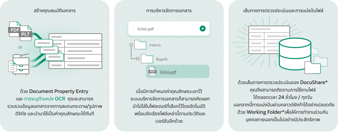นี่เป็นเหตุผลที่ DocuWorks ภูมิใจนำเสนอโซลูชันการบริหารจัดการเอกสารแบบดิจิทัลที่คุณไว้วางใจได้ เพื่อให้ขั้นตอนการทำงานทั้งหมดรวมไว้ในที่เดียวโดยเริ่มต้นจากฐานข้อมูลส่วนกลาง แพลตฟอร์มอัจฉริยะของเราช่วยให้คุณกำกับดูแลการสร้าง แจกจ่าย และจัดเก็บไฟล์ทั้งหมดที่จำเป็นต้องใช้ คุณจึงมองเห็นทุกอย่างและควบคุมขั้นตอนการทำงาน ตั้งแต่การออกแบบไปจนถึงการวางแผนและตรวจสอบคุณภาพของสินค้าที่ผลิต