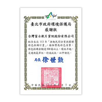 台灣富士軟片資訊 榮獲環境部112年 綠色採購及綠色消費推廣績優單位 感謝狀!