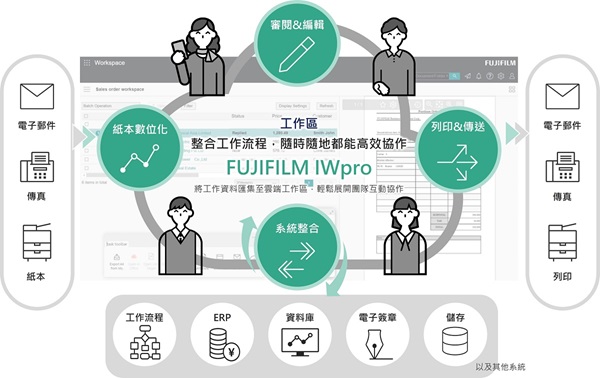 FUJIFILM IWpro透過用戶第一視角打造最直覺化的工作區,並將以往必須經由「個人 / 員工」串接的工作流程,轉變為透過「資訊」自動串聯員工/跨團隊的流暢辦公模式,單一平台即涵蓋整個工作流程。舉例來說,從來自各種管道的資料匯入(紙本、電子郵件、傳真、其他系統等)、OCR自動擷取關鍵資訊、團隊共享同步編輯到傳送雲端或列印輸出,甚至跨現有商務系統的操作,都能在FUJIFILM IWpro工作區內用最少步驟、最順暢的方式一站完成。