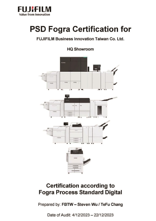 台灣富士軟片資訊目前共有 18 位色彩顧問取得 FOGRA Color Expert 1 資格,其中兩名顧問考取更高等級的 FOGRA DPP 色彩專家認證,其通過了色彩知識、系統操作測試與教育訓練等課程,才能被授予此認證,得以協助印刷業獲取FOGRA VPC國際認證的資格。