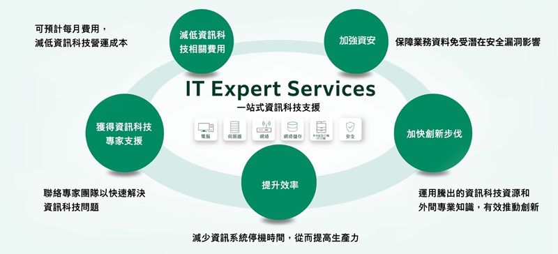 IT Expert Services可根據企業需求、預算、IT優先順序等,進行客製化IT託管服務及解決方案。這些服務可根據您的業務需求進行調整。