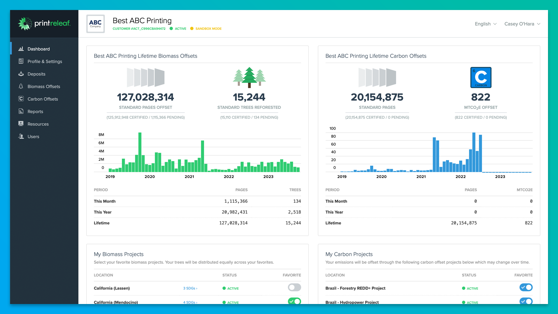 除了生質抵換,PrintReleaf 也提供「碳抵換服務(Carbon Offset)」,針對紙張/纖維材料在製造、運輸與處理過程產生的碳排放進行全面衡量。系統依標準紙張消耗量估算相對應的碳排放量,企業可購買由國際自願性碳權機構 Verra 發行的碳權,抵換等量碳排,達到「列印碳中和」的目標,該服務同樣可透過平台下載對應的報告與證書。