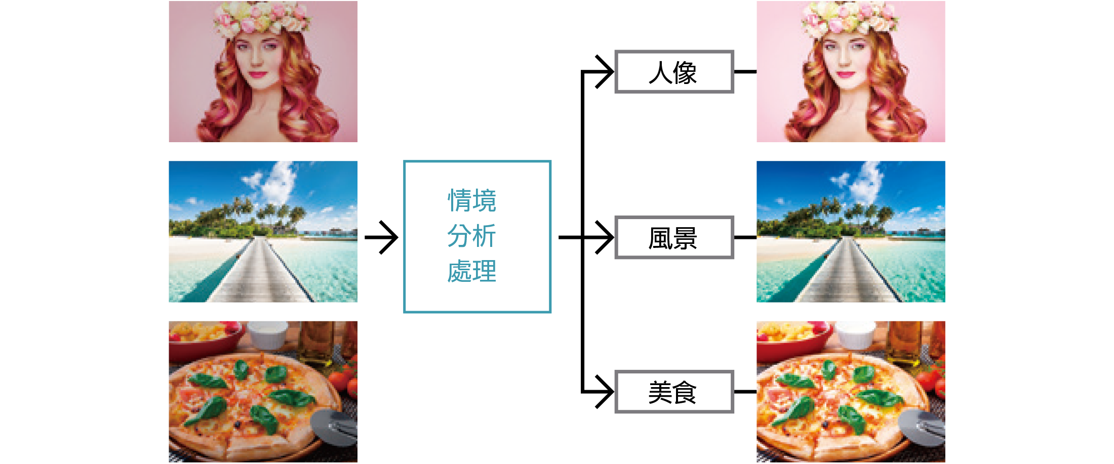 - RGB 影像,例如照片,透過自動化作業*10 偵測它們是「肖像」還是「場景」,並修正它們以符合特徵,讓它們更加美麗