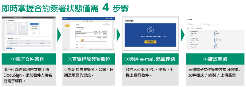 DocuSign® 讓您隨時隨地在各種裝置上(電腦、行動裝置),即時完成電子文件簽署,享受無邊界行動辦公的便利;超過82%文件(包含合約、報價單、協議書等)皆可在一天內完成簽署,幫助企業加速擴展商業進程。