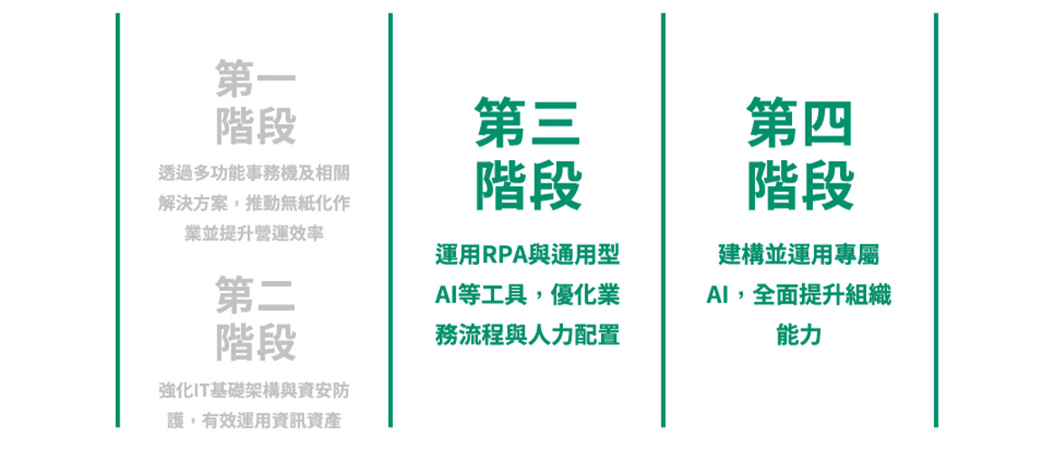 在第一階段支援導入多功能事務機、第二階段負責託管IT服務之後,富士軟片 資訊自然具備優勢,能在導入平台時持續提供營運、維護與支援服務。瀧澤基 補充:「這就是真正綜效。我們提供長期支援,且隨著各階段的推進,讓客戶 看到更高的價值與成果。」