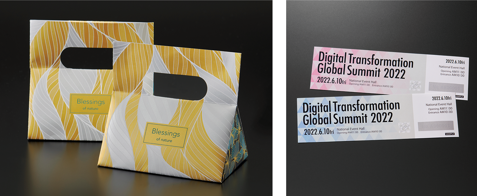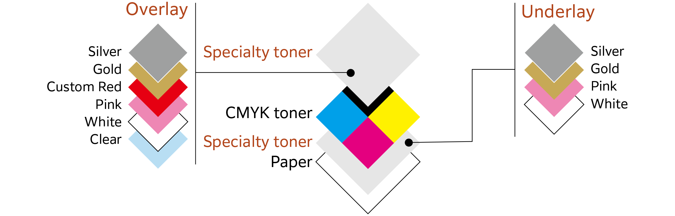 In addition to CMYK toner, the press can load a maximum of two specialty toner stations. For specialty toner, choices of Clear*1, Gold, Silver, White, Pink and Custom Red*1*2 toners are available. By overlaying CMYK on Silver or Gold, you can print various brilliant metallic colours. The rich colour expressions created by the 6-colour print engine can expand your business.