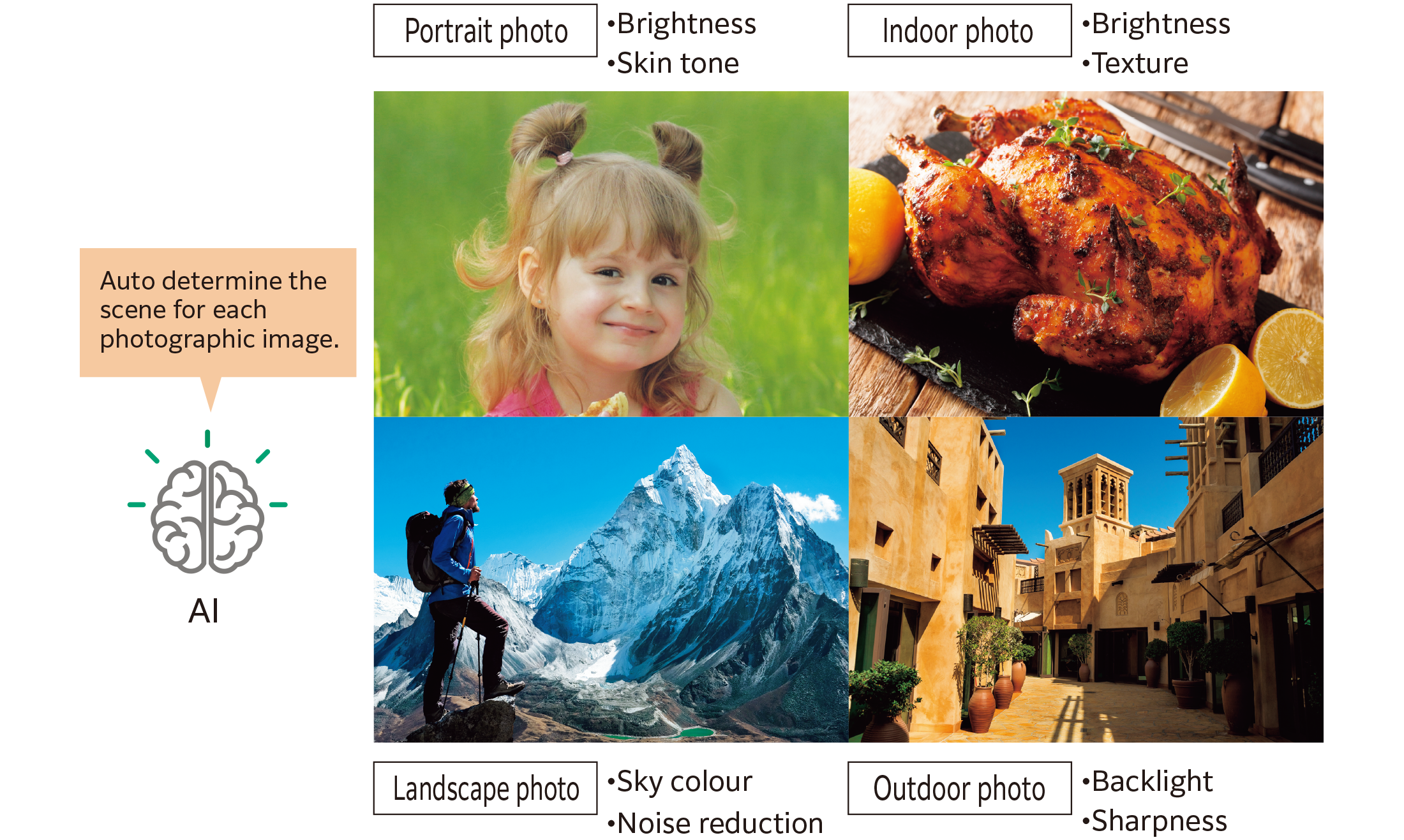 AI (Artificial Intelligence) automatically determines the scene for each photographic image on the page and corrects the image appropriately for each of them. Low quality images, such as poor contrast and brightness, can be automatically corrected.