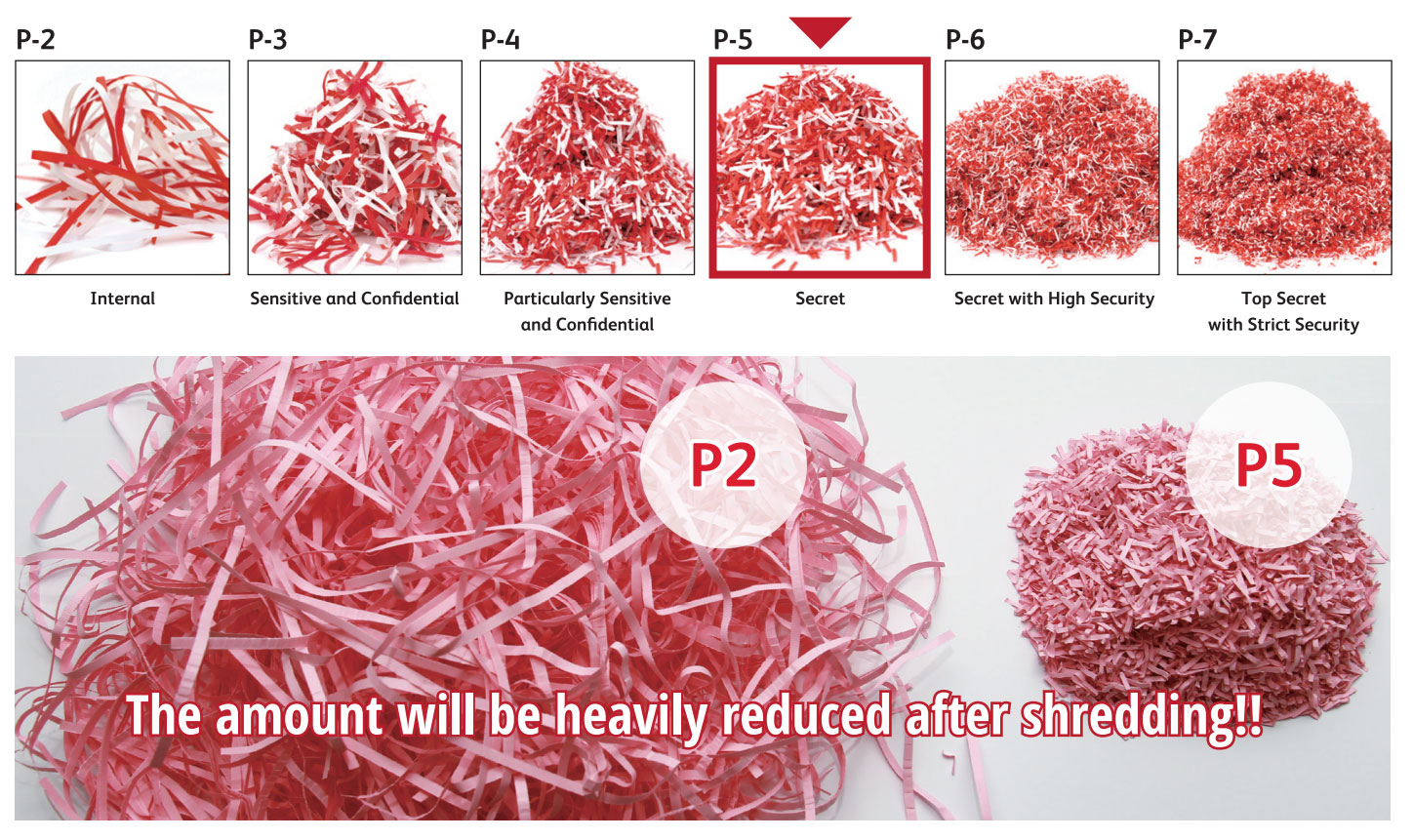 The shredders follow DIN 66399 standard, level P-5 (shred width 2x15mm) which is recommended for data carriers with secret information.