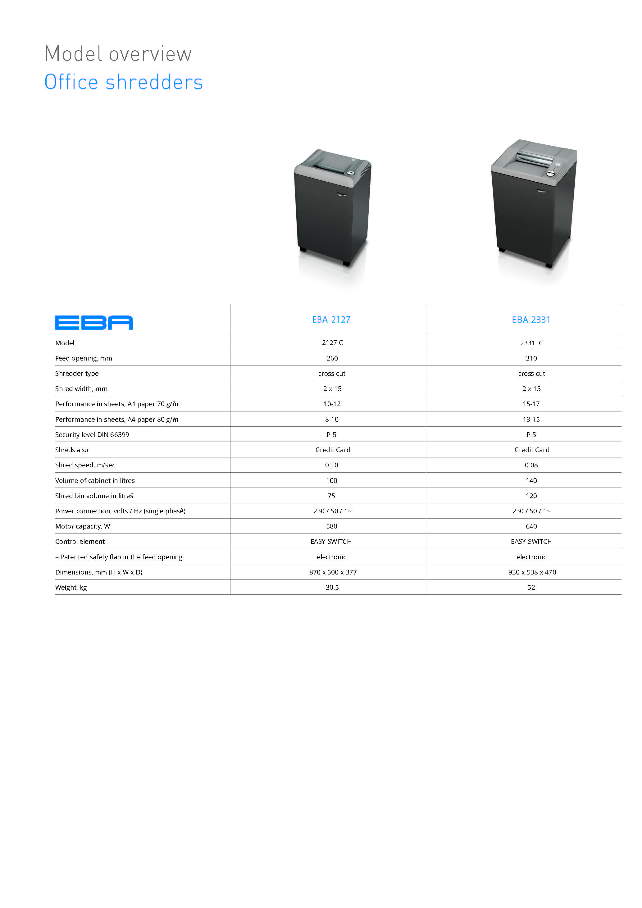 EBA shredders are particularly safe and easy to operate. In this connection, the SPS (Safety Protection System) can certainly be seen as an important milestone. SPS features include, for example, a patented, electronically controlled safety flap in the feed opening; automatic reverse and power cut-off (avoids paper jams); automatic stop if the shred bin is full; electronic door protection; double motor protection against overheating.