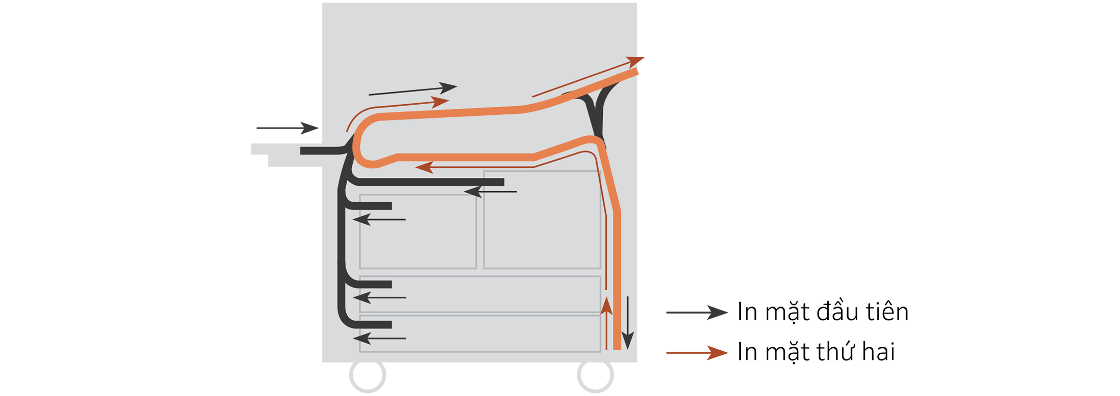Góc xoay rộng trong đường dẫn giấy giúp truyền giấy một cách nhanh chóng và ổn định. Thiết bị này có khả năng chống kẹt giấy bằng cách sử dụng cơ chế đảo giấy dọc để in hai mặt nhằm giảm các đoạn cong trên đường dẫn giấy.