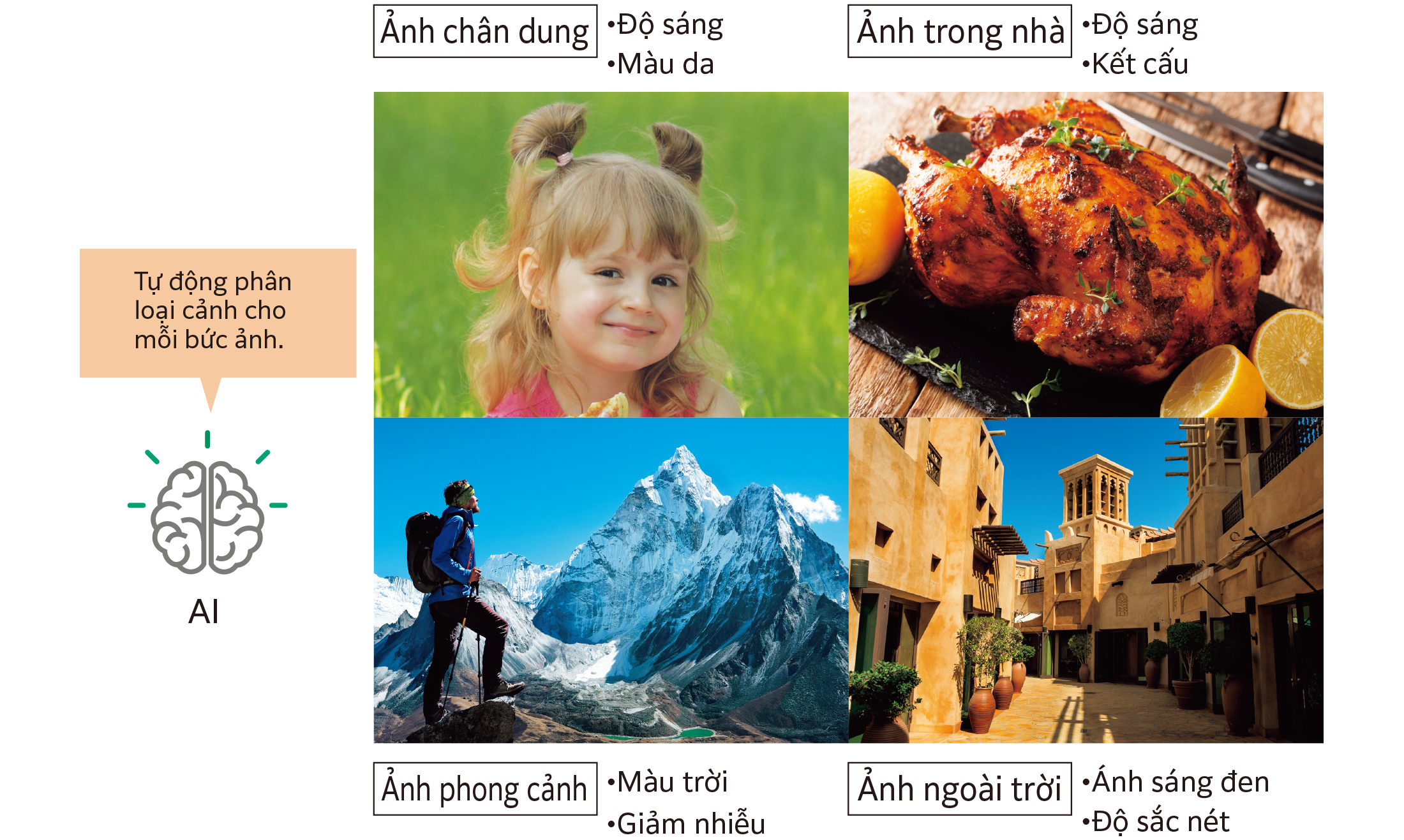 AI (Trí tuệ nhân tạo) tự động phân loại cảnh cho từng bức ảnh trên trang và chỉnh ảnh phù hợp cho từng cảnh. Các hình ảnh có chất lượng kém như độ tương phản/ ánh sáng đều có thể được tự động điều chỉnh đẹp lên.