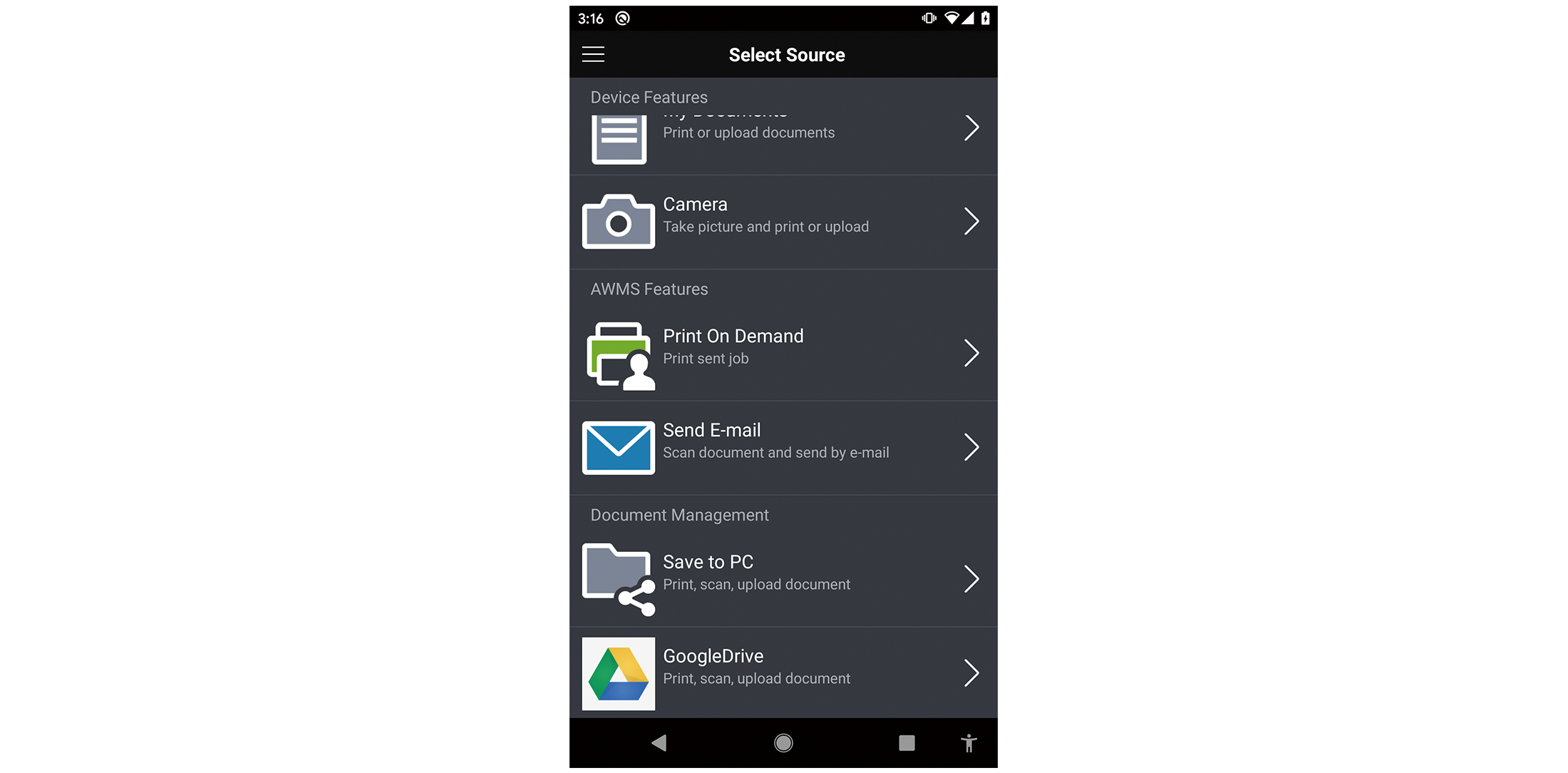 Cung cấp một ứng dụng dành riêng cho thiết bị di động. Bạn có thể quét hay in ra bằng cách thao tác trực tiếp trên giao diện người dùng với thông tin thiết lập, thông tin người dùng và thiết bị đã cài đặt trong ApeosWare Management Suite 2 trên thiết bị di động. Bạn cũng có thể dễ dàng chỉ định các thiết bị quét hoặc đầu ra bằng cách sử dụng mã QR Code.