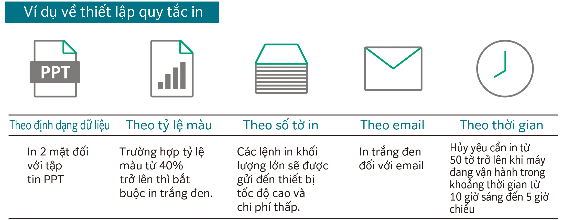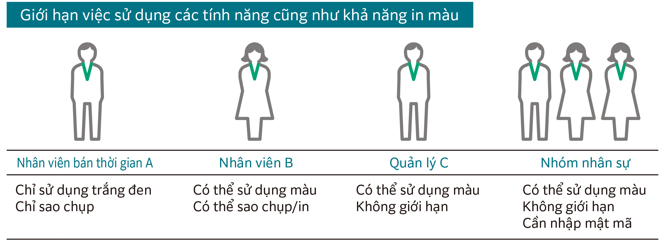 | Cung cấp các chức năng cơ bản như quản lý thiết bị, người dùng, lịch sử công việc trong một cấu hình tất cả trong một. | Có thể cấu hình dự phòng và phân phối. Các tính năng in theo nhu cầu và quản lý chi phí là tính năng tiêu chuẩn. |