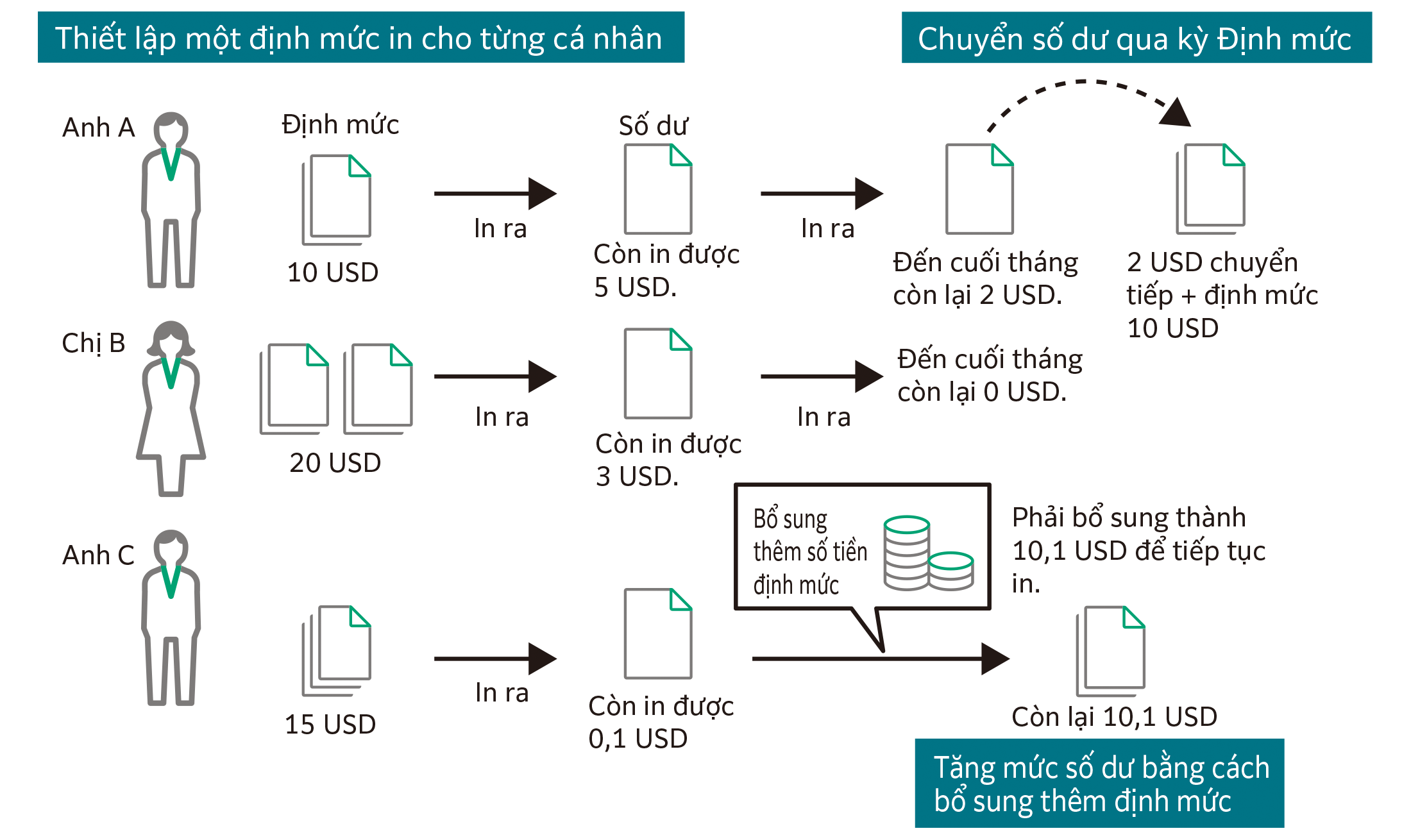 Có thể hiển thị hạn ngạch sử dụng của người dùng. Ngoài ra còn hiển thị mức độ chênh lệch của từng người dùng đối với các hạng mục như tỷ lệ in màu, in 2 mặt, in dồn trang, v.v. so với tiêu chuẩn do nhà quản trị quy định.