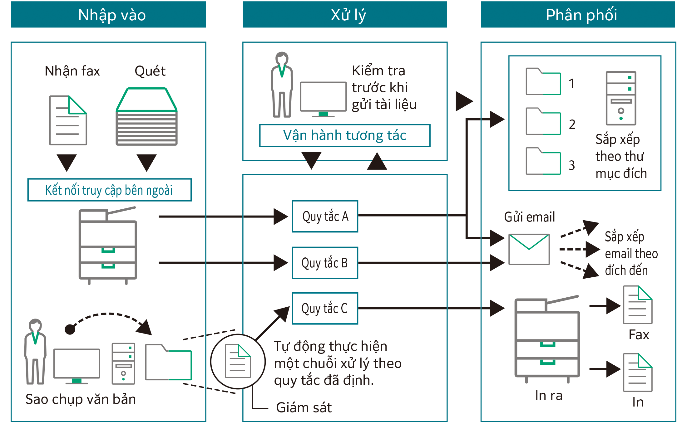 Bạn có thể thiết lập trước các quy tắc "luồng tài liệu" đối với nhiều thao tác xử lý khác nhau. Chỉ cần nhập tài liệu vào từ fax nhận được các các thao tác quét, một chuỗi các thao tác sẽ được tiến hành tự động từ xử lý, phân phối, in ra hoặc lưu trữ.