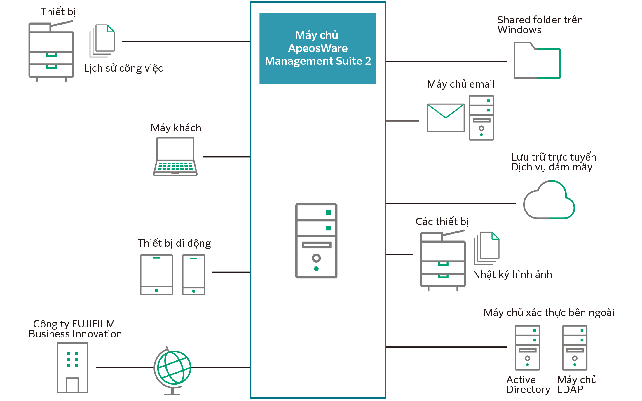 - Khách hàng trao đổi thông tin hàng ngày trên nhiều nền tảng như các thiết bị đa chức năng, máy tính cá nhân, hệ thống công việc, dịch vụ đám mây, v.v. ApeosWare Management Suite 2 có khả năng kết nối với một loạt các thiết bị và hệ thống mà khách hàng đang sử dụng, thúc đẩy đầu vào và đầu ra của tài liệu.