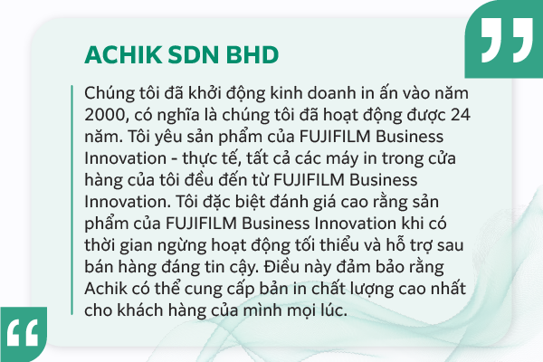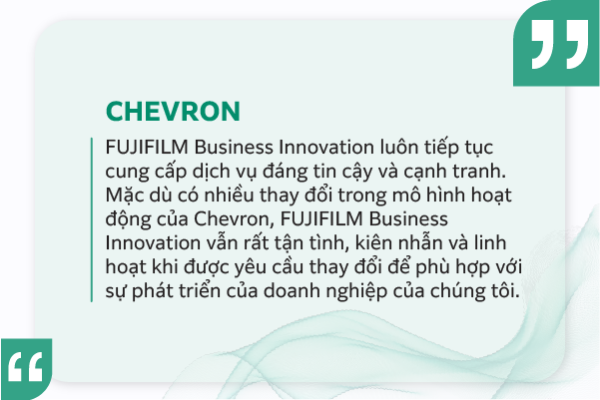 Trong suốt thập kỷ qua, FUJIFILM Business Innovation đã làm việc với khách hàng và đối tác của chúng tôi để đáp ứng các nhu cầu đa dạng của họ với bộ giải pháp tùy chỉnh và sẵn có. Đọc câu chuyện của họ và tìm hiểu cách chúng tôi đã giải quyết những thách thức kinh doanh chính của họ với những kết quả xuất sắc, từ việc tăng doanh thu, tăng năng suất đến tính bền vững lâu dài.