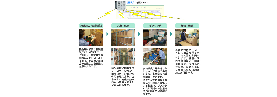 エンドユーザーが修理・メンテナンスのために必要とされるパーツ。エンドユーザーの機械を常に正常に稼動させるため、メーカー(お客さま)は、機器の種類、ラインアップにより数万点ものパーツを保管しなければなりません。これらの中から、必要なパーツを迅速に全国へ送り届けるためには、「多品種・多形態・少量」という特性があるパーツの、入庫から受注、配送までの物流を最適に管理することが条件となります。富士フイルムロジスティックスは、お客さまが集中し、ハブ機能の高い東京都内という絶好の立地に中央倉庫の大量処理機能と地区配送センターの小口処理機能を併せ持つパーツセンターを構え、受注から配送の一括管理システム“LIBRA”を駆使した全国各地への緊急配送体制を確立。円滑なパーツ業務を可能にします。