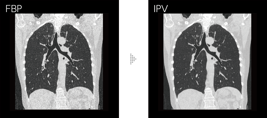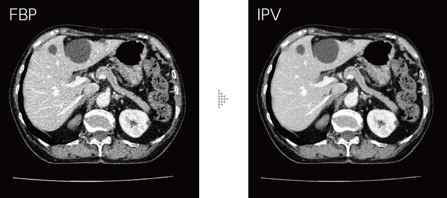 Our iterative reconstruction method, Intelli IPV, provides images that maintain their natural texture even at high noise reduction rates and their excellent visibility even at low doses, and does not require a dedicated operating room or additional hardware.