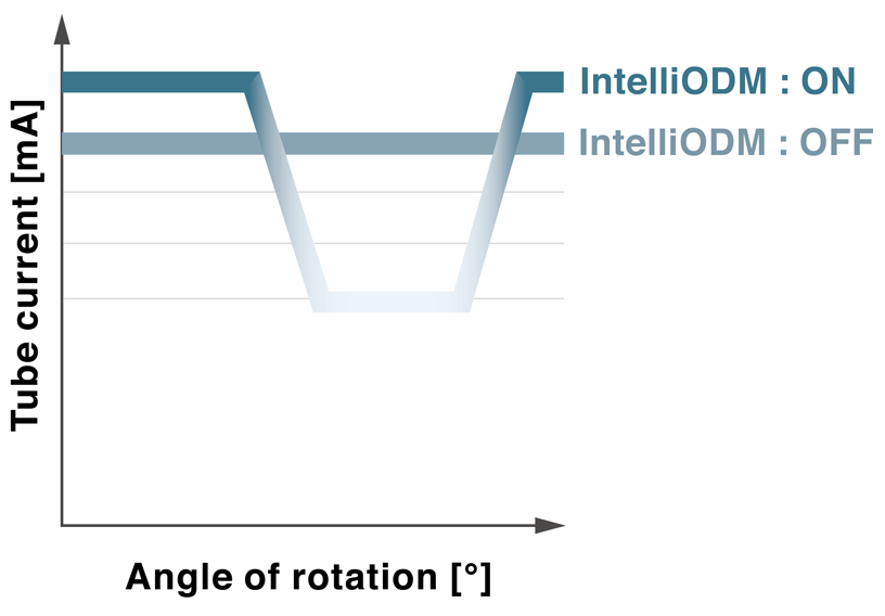 IntelliODM organ-based tube current modulation reduces dose from the anterior side where locate radiation sensitive anatomy such as lenses as much as 30% without any image quality compromise.
