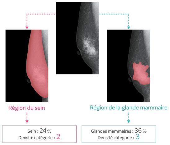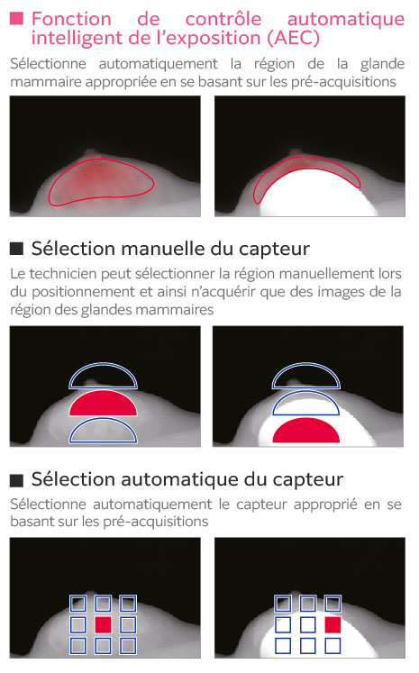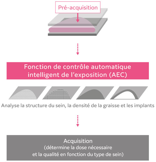 La position de la glande mammaire dans le sein est analysée à partir des pré-acquisitions obtenues avec une faible dose de rayonnement. Seule la région de la glande mammaire est utilisée, ce qui permet une imagerie avec des facteurs techniques et une dose appropriés. Même les implants mammaires, pour lesquels il est souvent difficile de déterminer la technique manuelle correcte, peuvent être automatiquement visualisés en identifiant la région où se trouve l’implant.