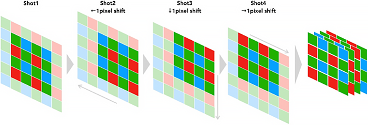 In order to obtain accurate RGB information for all of the pixels, four images are taken, shifting the image sensor pixel by pixel.